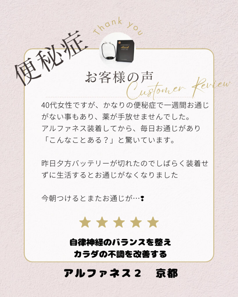 アルファネス2を装着すると、なんとその日からまたお通じが戻ったとのこと。