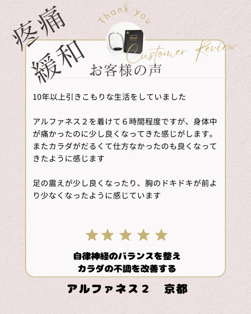 - アルファネス2を着けて6時間で「痛み」「だるさ」が軽減