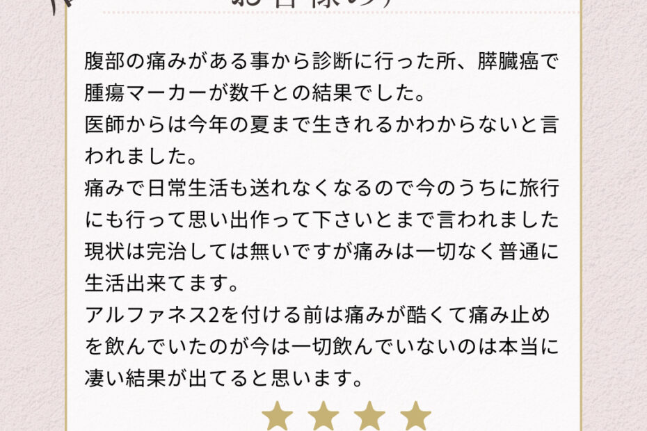 ステージ4の癌のお客様がアルファネス2で改善した口コミ